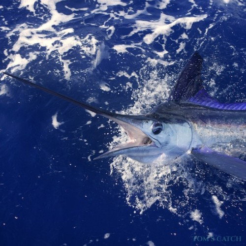 Le marlin bleu aussi nommé le makaire bleu (Makaira nigricans) est probablement le poisson plus populaire entre les pêcheurs. Ce poisson, connu pour sa lutte explosive, se nourrit surtout pendant la journée de calamar, poisson et poulpes. En haute mer, l'on cible ce déprédateur généralement à la traine avec des leurres et avec des appâts naturels (bonite, maquereau...)